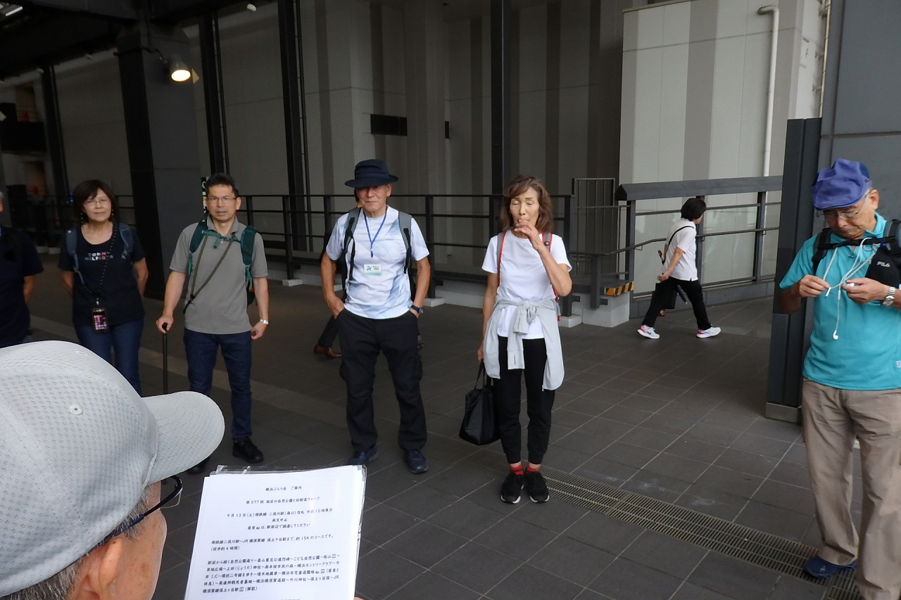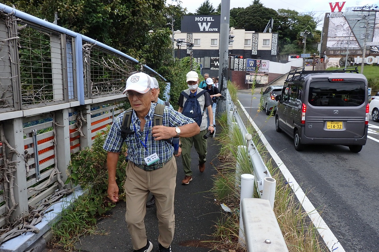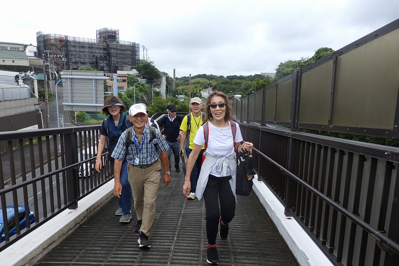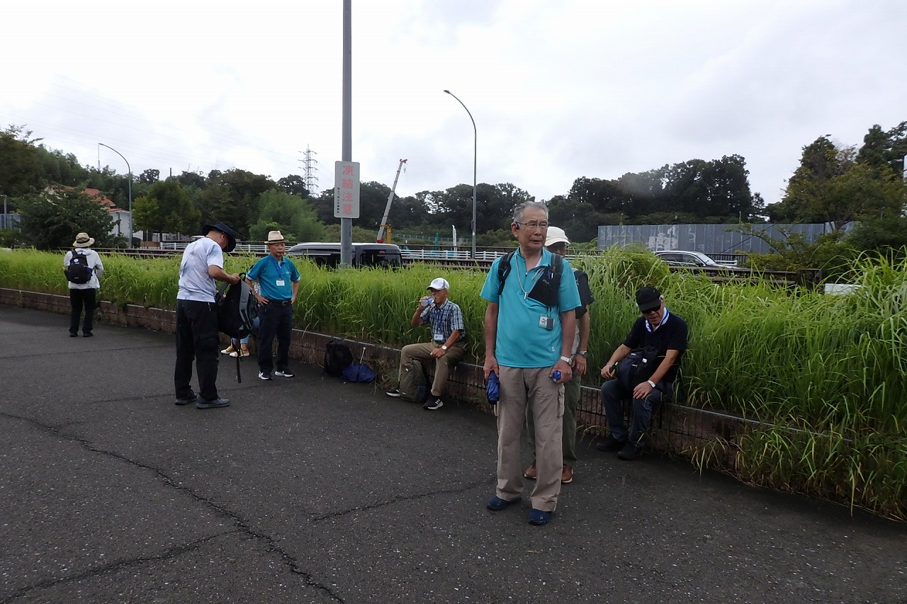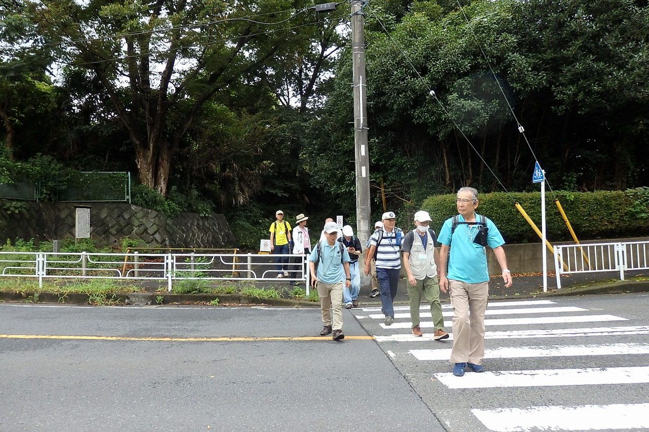 2025年9月13日(土)雨雲レーダーで見ると雨天が心配でしたが実際は一時小雨で過ごせました。この日は一気に平年気温になり、涼しさも感じられるような絶好のウォーキング日和となり17名の参加者で実施しました。相鉄線の二俣川駅改札前に10時集合。受付を済ませ、いつものように談笑の輪ができました。世話役の挨拶を聞いて歩きを開始。駅前から続く自然公園通り~畠山重忠公遺烈碑~こども自然公園~桜山🚻~草